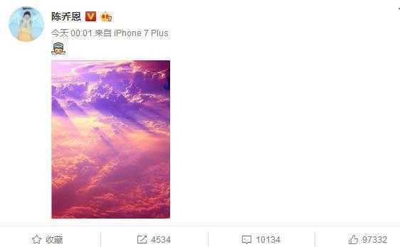 陈乔恩在9月16日凌晨发布了一条微博,一个小天使的表情配上粉紫色的天空,粉色是乔任梁最喜欢的颜色,所以这条微博便是用来纪念乔任梁的逝世。