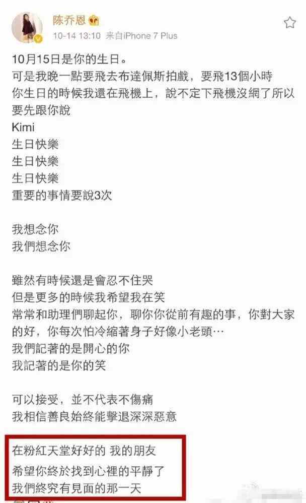 在乔任梁离世后不久就是他的生日,陈乔恩依然在微博上祝贺乔任梁生日,并称要他在粉红天堂好好的,两人迟早会相见,这种感情令人动容。