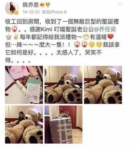 乔任梁更是在圣诞节时送给了陈乔恩一只两个人那么大的巨型抱熊,陈乔恩还发微博表示惊喜,两人的情谊可见一斑。
