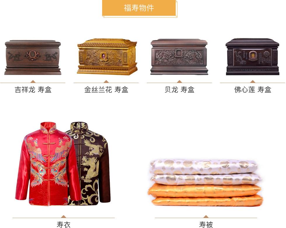 1. 吉祥龙、金丝兰花、贝龙、佛心莲等(10选1) 2. 寿衣全套 (材质:锦缎) |
