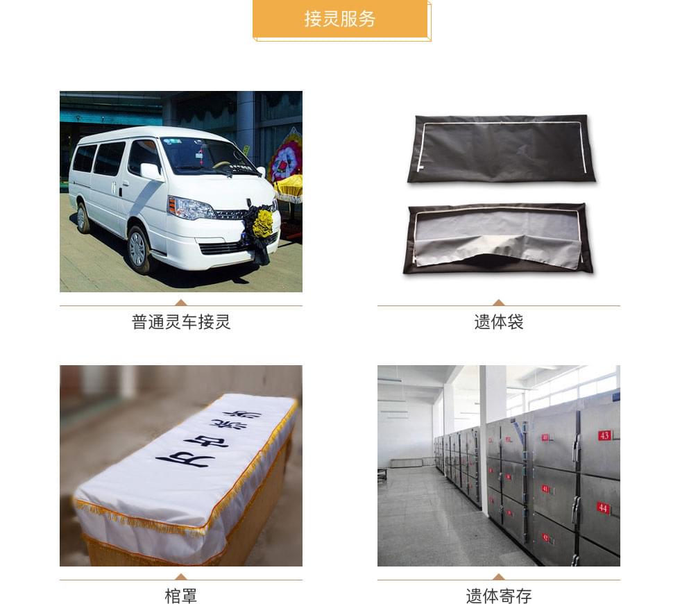 1. 普通灵车一次(1次) 2. 遗体袋一个(1个) 3. 棺罩一个(1个) 4. 遗体寄存(3天内,1次) |